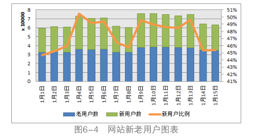 如圖6-4所示,可以用柱狀堆積圖顯示新用戶和老用戶的數(shù)量變化,堆積的結(jié)果就是網(wǎng)站總用戶數(shù)量的變化,結(jié)合新用戶比例的折線,通過(guò)分析網(wǎng)站新用戶的數(shù)量和比例的變化能夠直接反映網(wǎng)站在營(yíng)銷推廣上的效果。