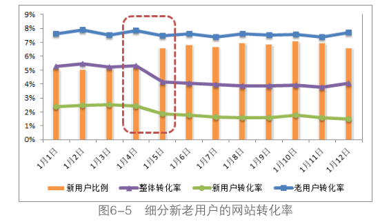 圖6-5展示的是1月份前幾天每天細(xì)分新老用戶的網(wǎng)站轉(zhuǎn)化率變化趨勢(shì),同時(shí)加入了新用戶比例的數(shù)據(jù),從圖表上看,1月4日之后整體轉(zhuǎn)化率的趨勢(shì)有明顯的下滑,同時(shí)新用戶比例明顯上漲,可能網(wǎng)站展開(kāi)了新一輪的推廣。我們需要分析整體轉(zhuǎn)化率的下降與網(wǎng)站的推廣是否存在必然聯(lián)系,于是需要細(xì)分新老用戶的轉(zhuǎn)化率,上圖中老用戶的轉(zhuǎn)化率幾乎維持不變,而新用戶的轉(zhuǎn)化率也從1月4號(hào)后開(kāi)始出現(xiàn)下滑,所以通過(guò)用戶細(xì)分后的轉(zhuǎn)化率趨勢(shì)分析,基本上可以判斷網(wǎng)站整體轉(zhuǎn)化率的下降是由于網(wǎng)站推廣帶來(lái)的新用戶轉(zhuǎn)化率過(guò)低導(dǎo)致的,與網(wǎng)站本身的運(yùn)營(yíng)沒(méi)有關(guān)系。所以還是那句話,老用戶是網(wǎng)站建設(shè)生存的基礎(chǔ),新用戶是網(wǎng)站發(fā)展的動(dòng)力,細(xì)分老用戶的數(shù)據(jù)可以分析網(wǎng)站當(dāng)前的根基是否牢固,同時(shí)排除網(wǎng)站營(yíng)銷推廣的干擾;細(xì)分新用戶的數(shù)據(jù)可以分析網(wǎng)站營(yíng)銷推廣中引入的流量質(zhì)量,同時(shí)消除了憑借原始積累的“吃老本”的情況。